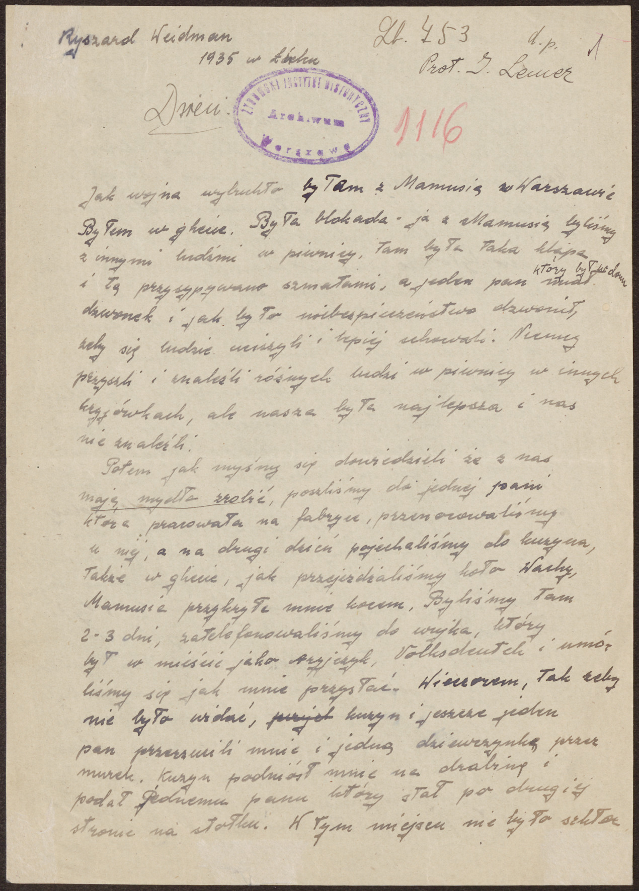 Aha! Jest chłopak i kobieta!Wszedł do naszego pokoju, powiedział, żeby z nim pójść, zabrał tej pani łańcuszek, 500 złotych, które ona miała na majątku i płaszcz. Mnie kazał pokazać to, co nie potrzeba. Powiedział że o 12 h po nas przyjdzie. To był także Żyd. Uciekliśmy. Ja z gospodarzem do jednej pani. Tam zastałem tą panią, która nam rewizję nasłała i jednego pana podobnego do tego, który u nas był. Pytał się o tamtego, jakiego był wzrostu, jak ubrany. Tam byłem 3 tygodnie. Potem ciocia mnie stamtąd wzięła i dała do innej pani. Potem znowu ta chora pani bała się, że coś wybuchnie, i chciała żebym był blisko niej i przeniosła mnie na Piusa, bo ona była na Marszałkowskiej, więc żebym był blisko niej.