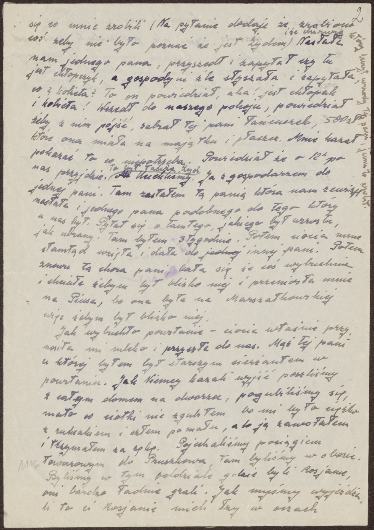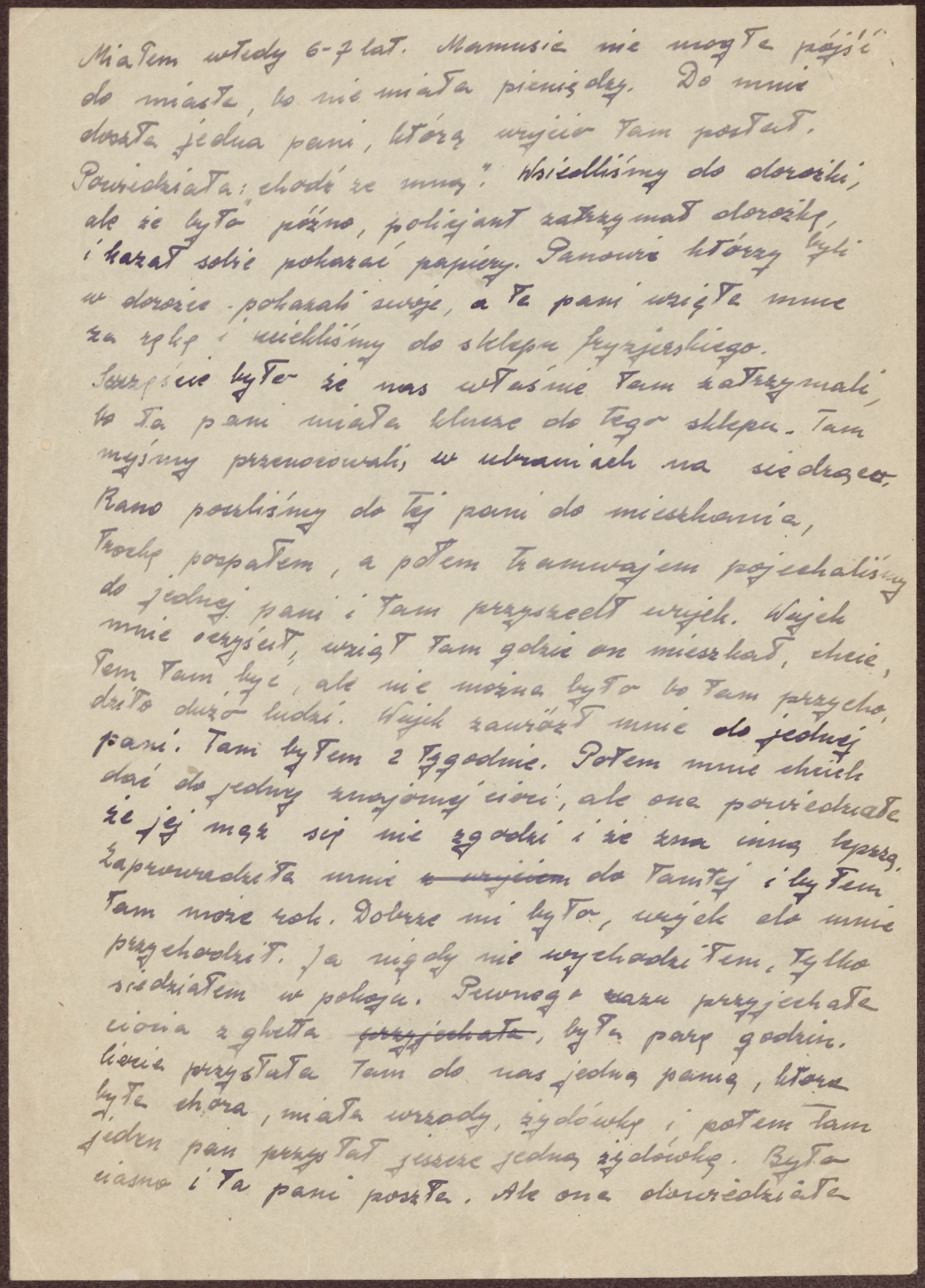 Rano poszliśmy do tej pani do mieszkania, trochę pospałem, a potem tramwajem pojechaliśmy do jednej pani i tam przyszedł wujek. Wujek mnie oczyścił, wziął tam gdzie on mieszkał, chciałem tam być, ale nie można było, bo tam przychodziło dużo ludzi. Wujek zawiózł mnie do jednej pani. Tam byłem dwa tygodnie. Potem mnie chcieli dać do jednej znajomej cioci, ale ona powiedziała, że jej mąż się nie zgodzi i że zna inną lepszą. Zaprowadziła mnie do tamtej i byłem tam może rok. Dobrze mi było, wujek do mnie przychodził. Ja nigdy nie wychodziłem, tylko siedziałem w pokoju. Pewnego razu przyjechała ciocia z getta, była parę godzin. Ciocia przysłała tam do nas jedną panią, która była chora, miała wrzody, Żydówkę, i potem tam jeden pan przysłał jeszcze jedną Żydówkę. Było ciasno i ta pani poszła. Ale ona dowiedziała